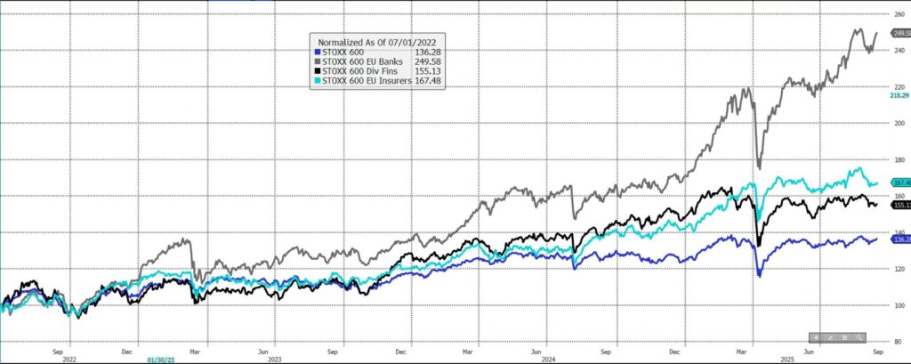 The STOXX 600 European Financials Sector, consisting of 50 banks (SX7P), 31 insurers (SXIP) and 38 diversified financials (SXFP) encapsulates the majority of themes driving world stock markets: Interest rates and inflation, credit cycles, sovereign risk, technology (FinTech) and commodities. Relative performance to the STOXX 600 since the dotcom bust underscores the appeal and versatility of specialist knowledge of these three critical subsectors.